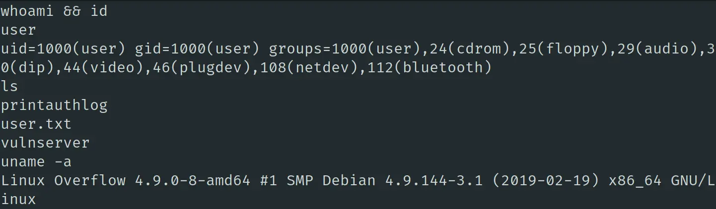 成功获得 user.txt,可见系统的版本很新,看内核版本应该是 debian 9,实际验证确实是。搜索靶机上的 SUID 文件,可以发现有 printauthlog,将该文件下载到本地进行分析。