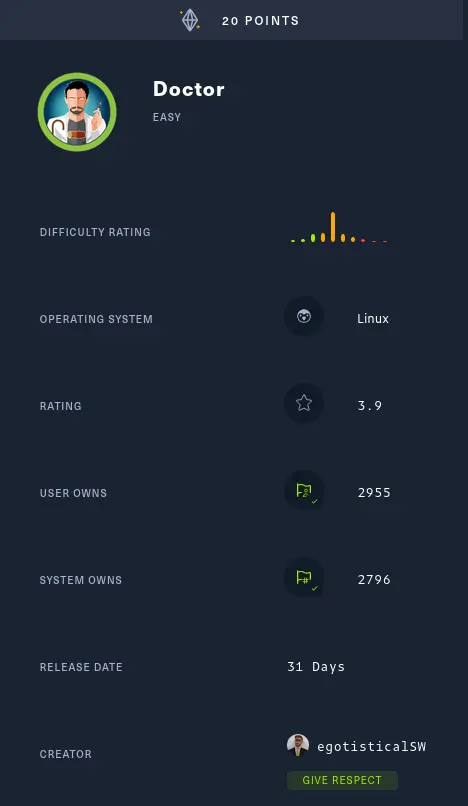 PORT STATE SERVICE VERSION 22/tcp open ssh OpenSSH 8.2p1 Ubuntu 4ubuntu0.1 (Ubuntu Linux; protocol 2.0) 80/tcp open http Apache httpd 2.4.41 ((Ubuntu)) |_http-server-header: Apache/2.4.41 (Ubuntu) |http-title: Doctor 8089/tcp open ssl/http Splunkd httpd | http-robots.txt: 1 disallowed entry |/ |_http-server-header: Splunkd |_http-title: splunkd | ssl-cert: Subject: commonName=SplunkServerDefaultCert/organizationName=SplunkUser | Not valid before: 2020-09-06T15:57:27 |_Not valid after: 2023-09-06T15:57:27 Service Info: OS: Linux; CPE: cpe:/o:linux:linux_kernel {% endblockquote %}